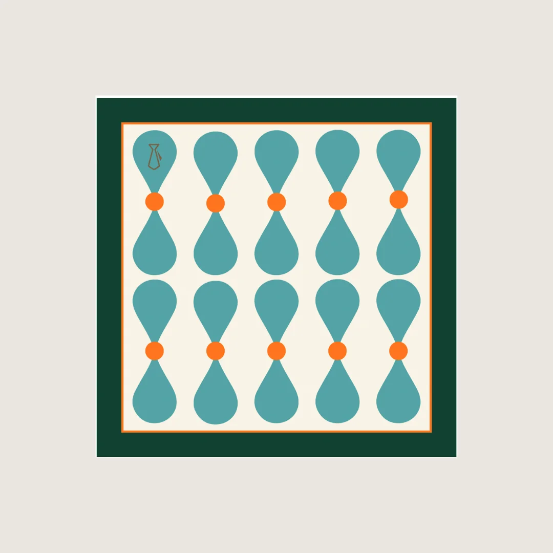 Eleve su sastrería con un toque de color sofisticado y vibrante. Este pañuelo de bolsillo presenta un patrón geométrico de inspiración vintage, donde gotas en azul cerceta se encuentran en perfecta simetría con núcleos de naranja intenso, enmarcados por un contorno verde botella.