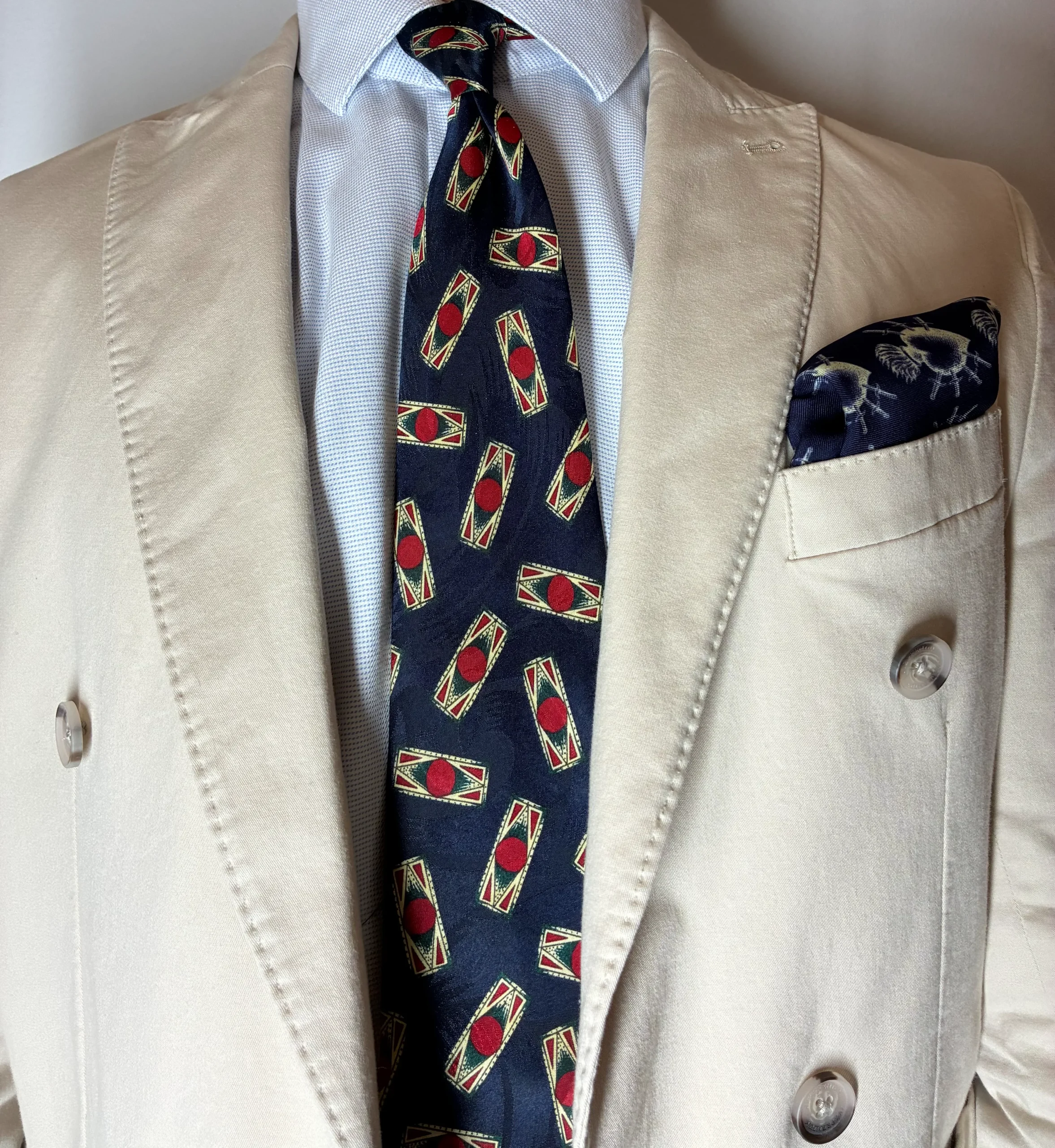Confeccionado en seda natural de alta calidad, el pañuelo ofrece una textura suave y ligera, con una caída impecable que aporta movimiento y luminosidad al conjunto. Su contraste cromático y su dibujo repetido permiten llevarlo tanto como punto de acento en un look formal como en combinaciones más desenfadadas con personalidad propia.