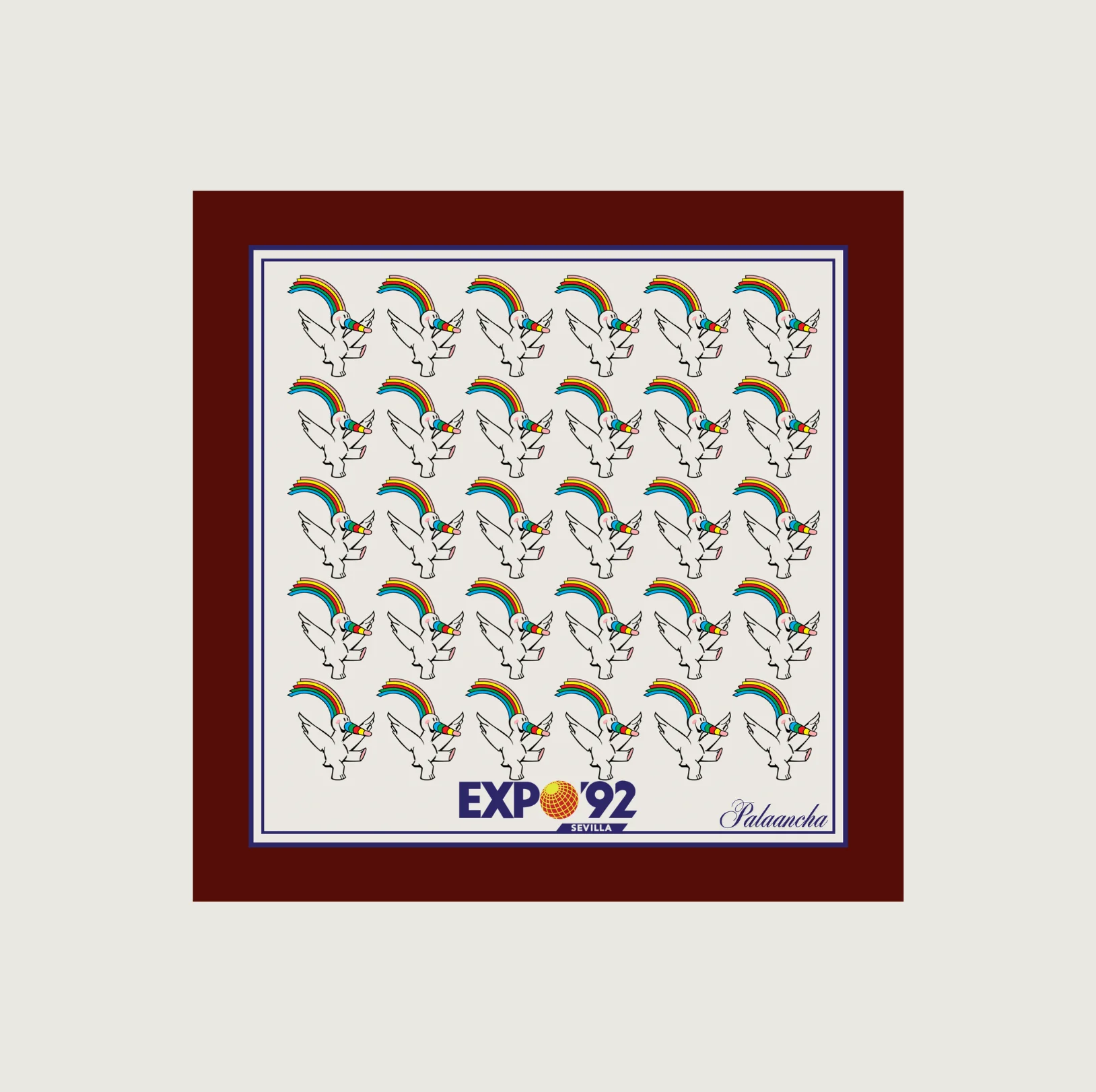 Más que un accesorio, este pañuelo es un guiño emocional: una celebración del optimismo, la imaginación y el espíritu abierto de la Sevilla del 92. Una pieza pensada para quienes entienden la elegancia también como memoria, cultura y alegría compartida.