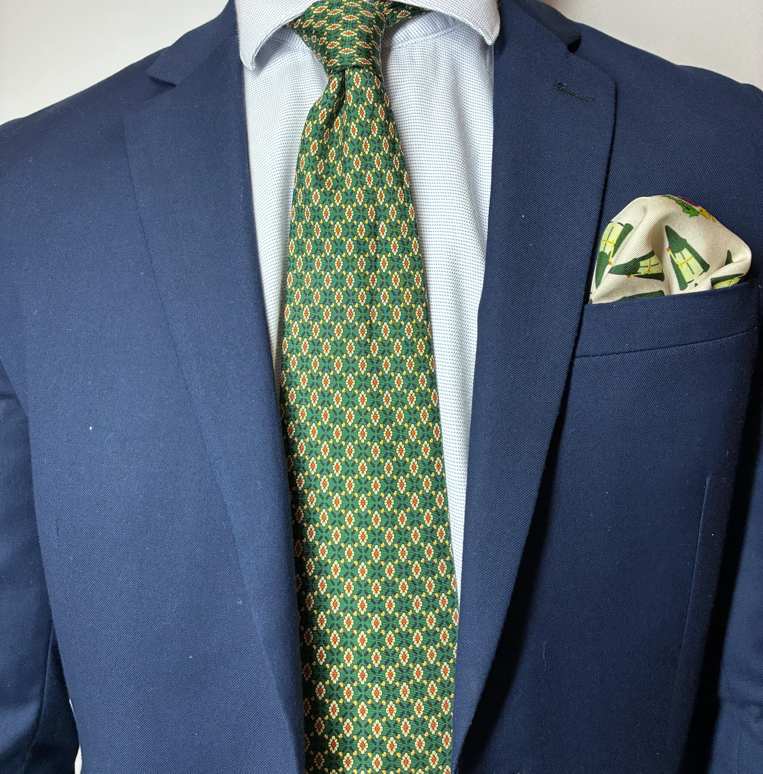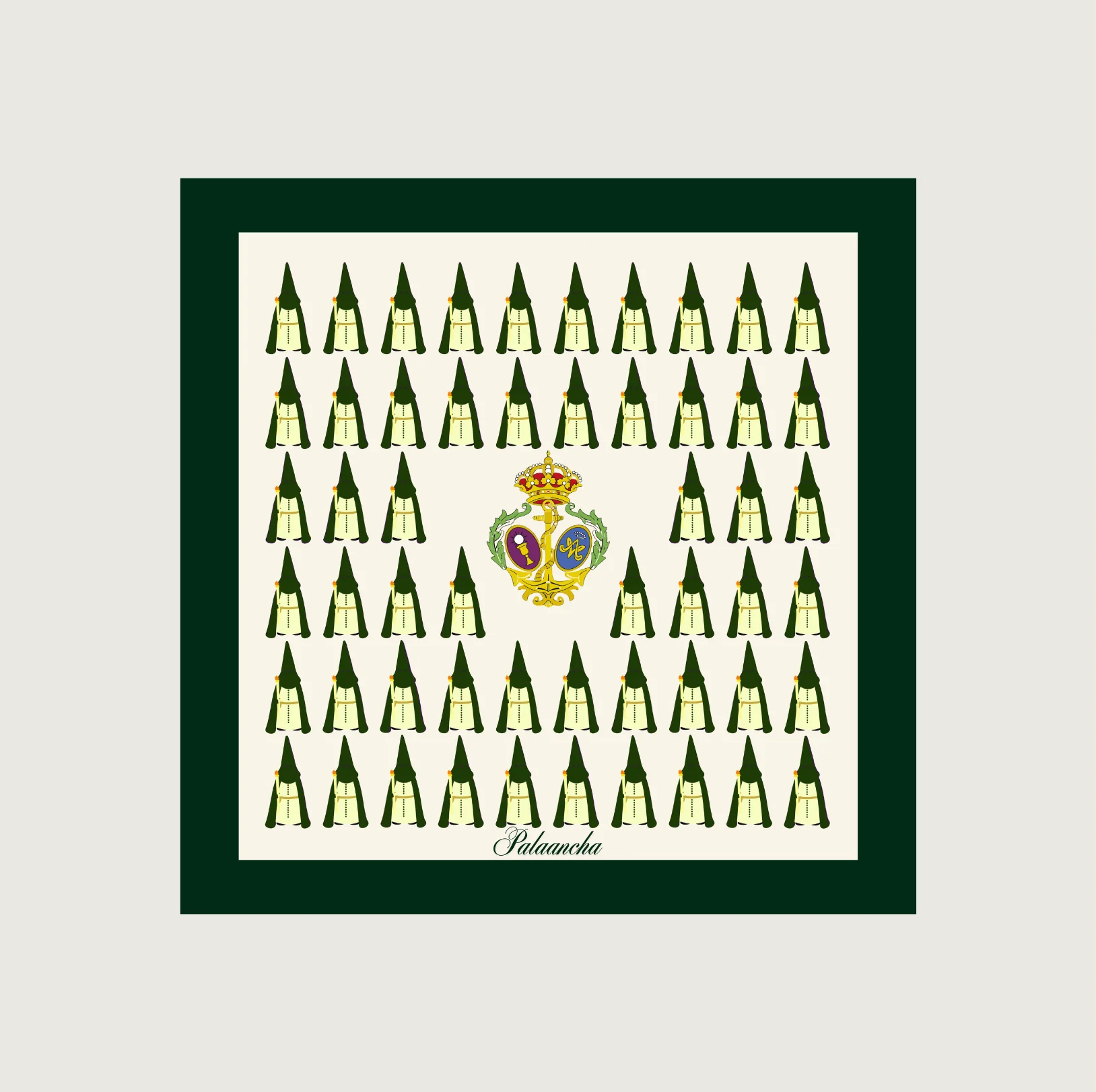 Este pañuelo de bolsillo en seda está inspirado en la identidad visual y devocional de la Hermandad de la Esperanza de Triana, tomando como elemento principal la figura del nazareno, uno de los símbolos más reconocibles de la Semana Santa sevillana. El diseño construye una composición rítmica a partir de la repetición ordenada de estas siluetas, evocando el avance solemne del cortejo durante la Madrugá.