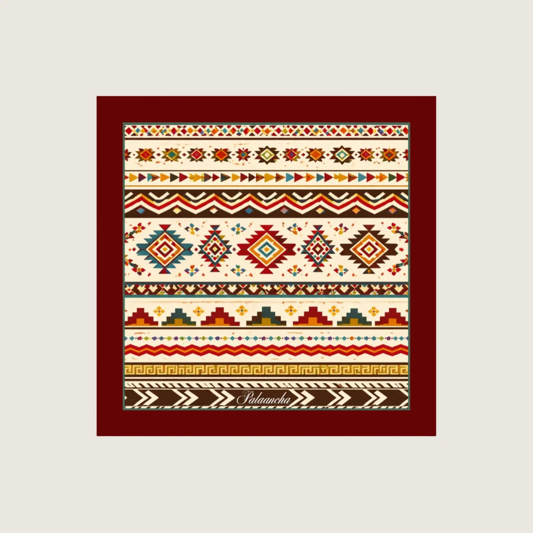 Los tonos cálidos se combinan con acentos en azul y verde para aportar contraste y vitalidad, evocando tejidos tradicionales y símbolos étnicos ancestrales trabajados con precisión gráfica.