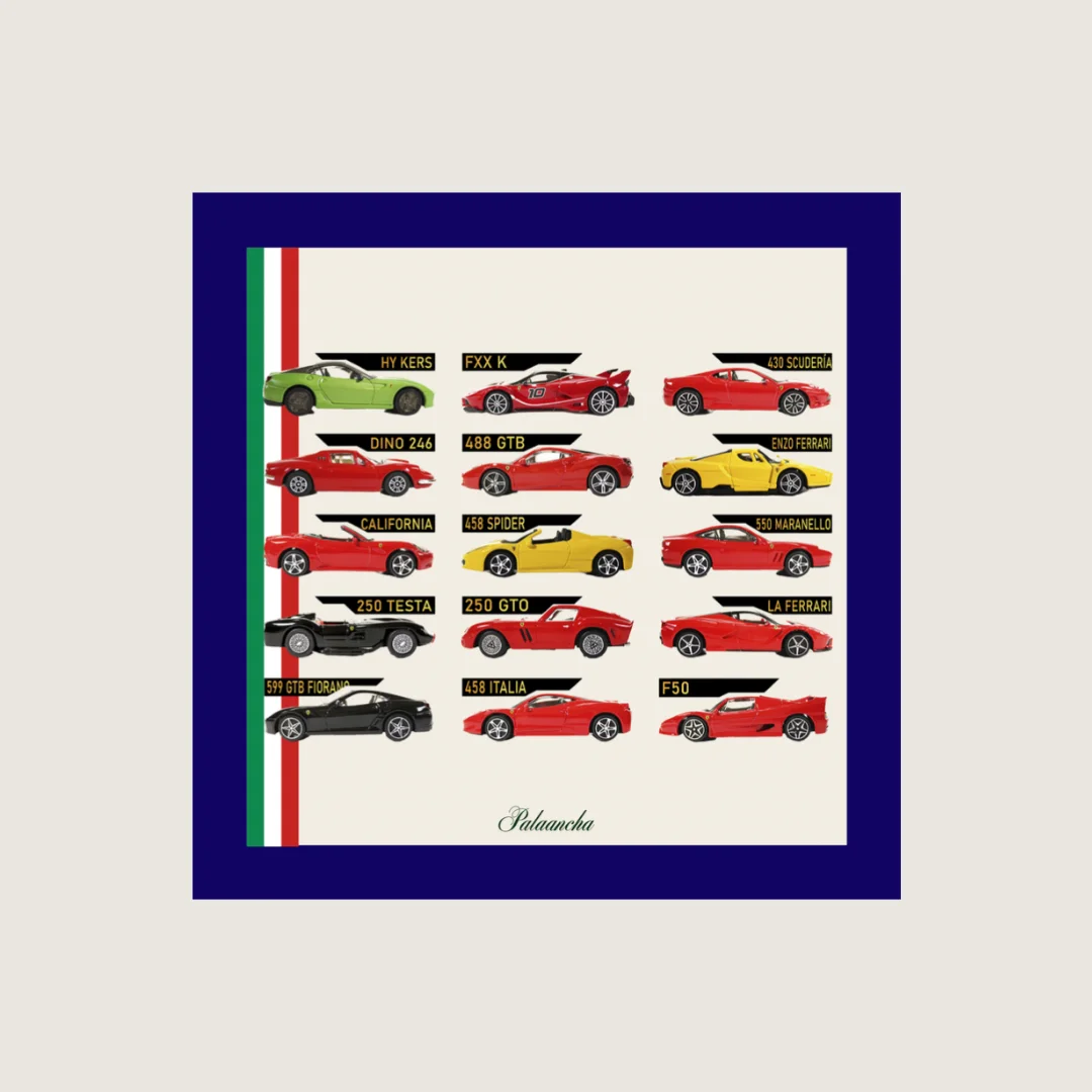 Este pañuelo de seda de bolsillo para hombre es una celebración del legado automovilístico italiano y del lujo atemporal. Inspirado en la mítica historia de Ferrari, los automóviles aparecen representados en tonos vibrantes de rojo corsa, amarillo y negro, creando un ritmo visual elegante y dinámico dispuestos con precisión gráfica sobre un fondo marfil cálido que realza cada silueta.