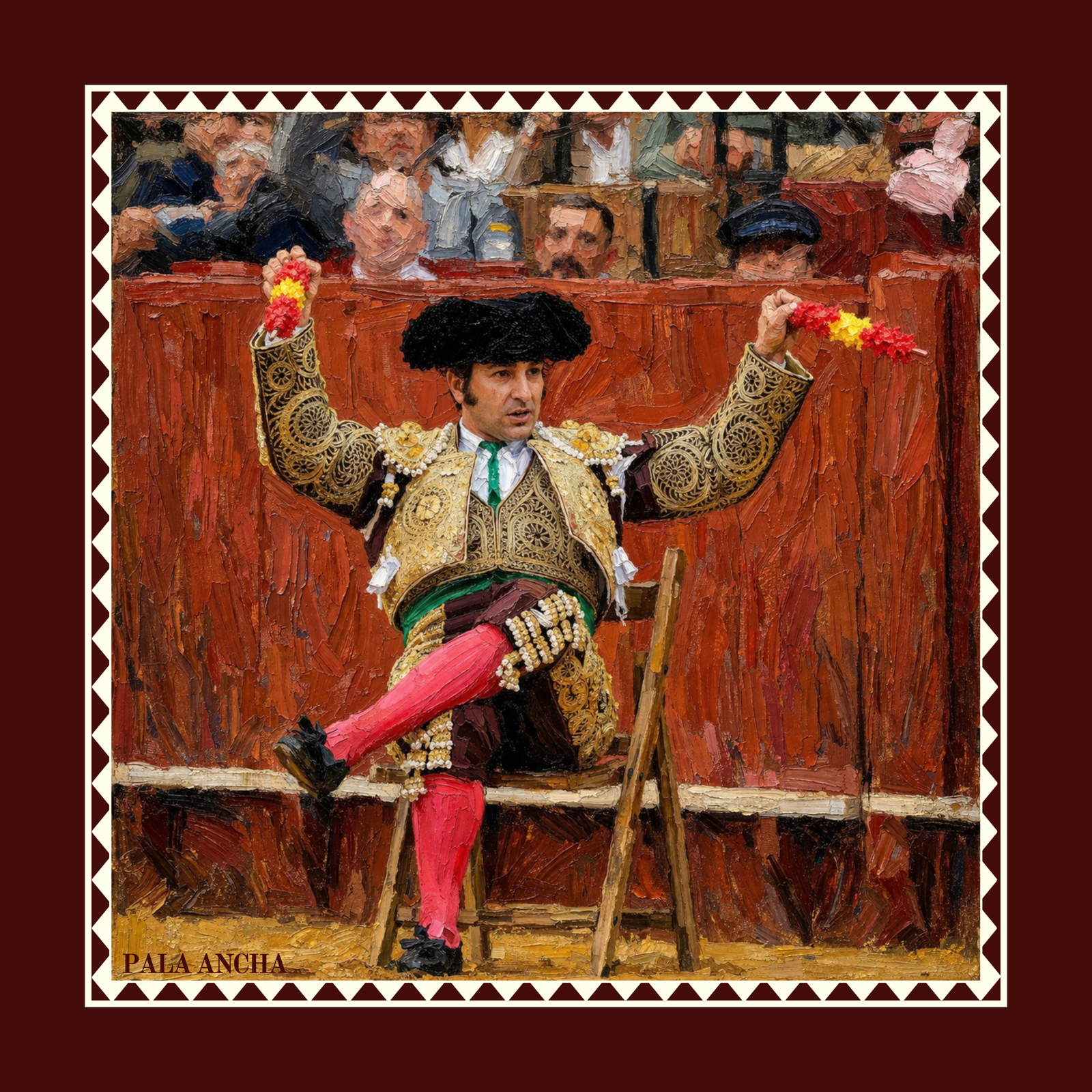 Un pañuelo de bolsillo de seda natural 100%, confeccionado en España, que captura la esencia más vibrante, valiente y estética de la tauromaquia contemporánea. Con un formato elegante de 26 cm, este diseño traslada al tejido la intensidad de una tarde histórica: la figura del torero, serena y poderosa, envuelta en tonos cálidos, bordados dorados y una composición pictórica de marcada textura, casi como una obra al óleo.
