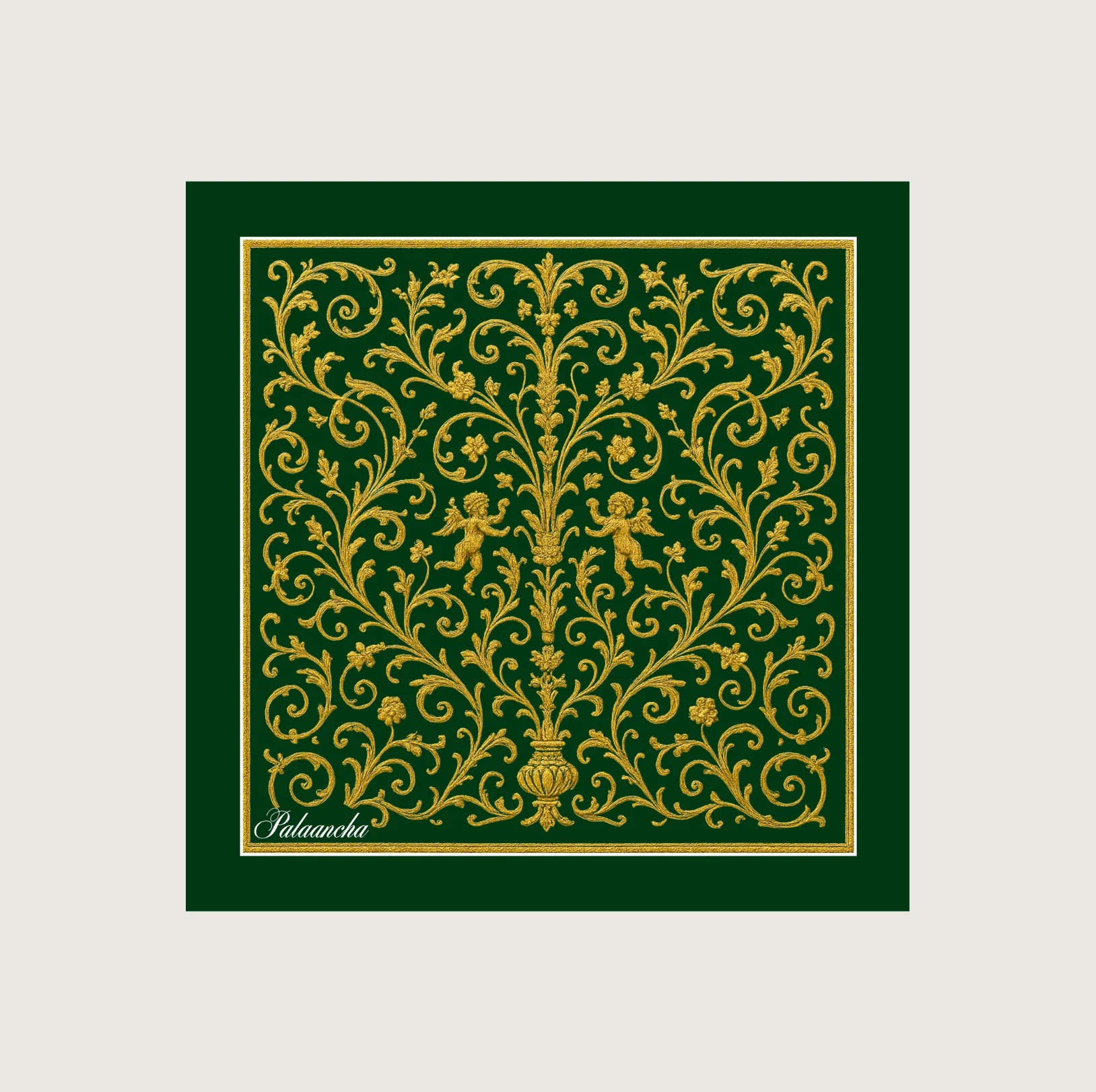 Sobre un profundo fondo verde, los motivos vegetales se despliegan con armonía y movimiento, formando una composición simétrica que recuerda a los tejidos ceremoniales y a la delicadeza del trabajo artesanal. En el centro, dos querubines acompañan el ascenso de las formas florales, aportando un aire celestial y atemporal que conecta con la iconografía clásica de los mantos de Virgen, símbolos de protección, luz y trascendencia.
