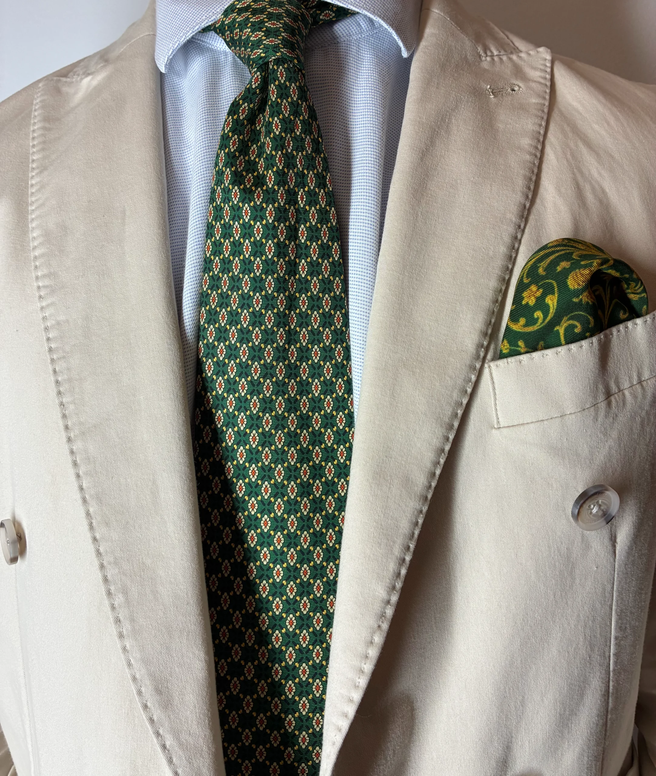 El contraste entre el dorado luminoso y el verde intenso genera una sensación de profundidad y riqueza visual, mientras que la seda natural de alta calidad aporta suavidad, ligereza y una caída elegante que realza cada pliegue. Su brillo sutil permite que el dibujo cobre vida con el movimiento, convirtiéndolo en un detalle distintivo tanto en estilismos formales como en combinaciones más personales.