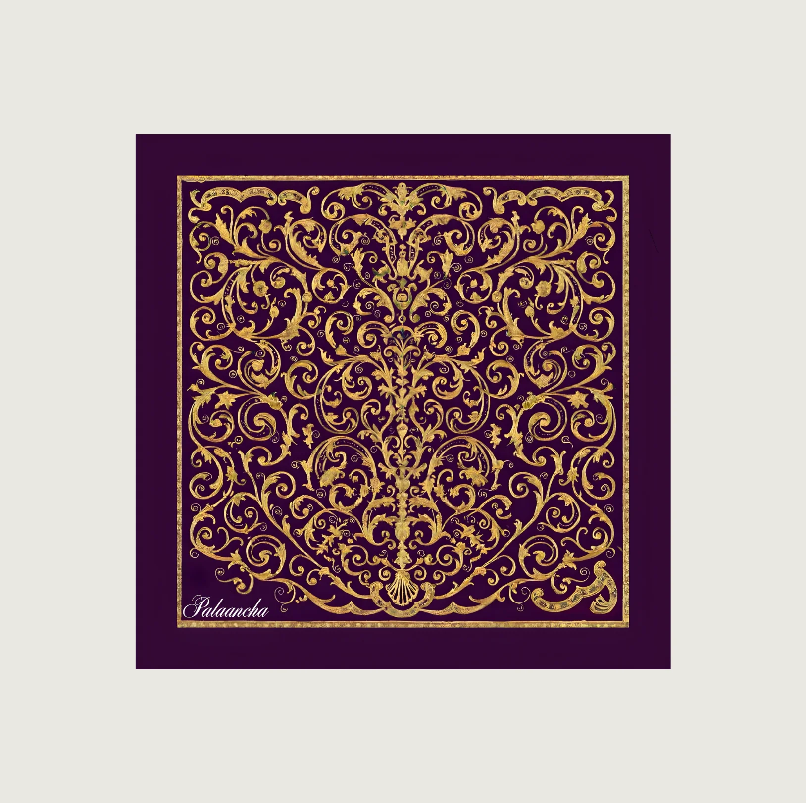 El brillo del oro, realzado por la seda natural de alta calidad, aporta profundidad y movimiento a la pieza, mientras su tacto suave y su caída impecable permiten integrarlo con naturalidad tanto en estilismos formales como en propuestas más personales. Cada pliegue revela nuevos matices del dibujo, convirtiendo el pañuelo en un detalle lleno de significado.