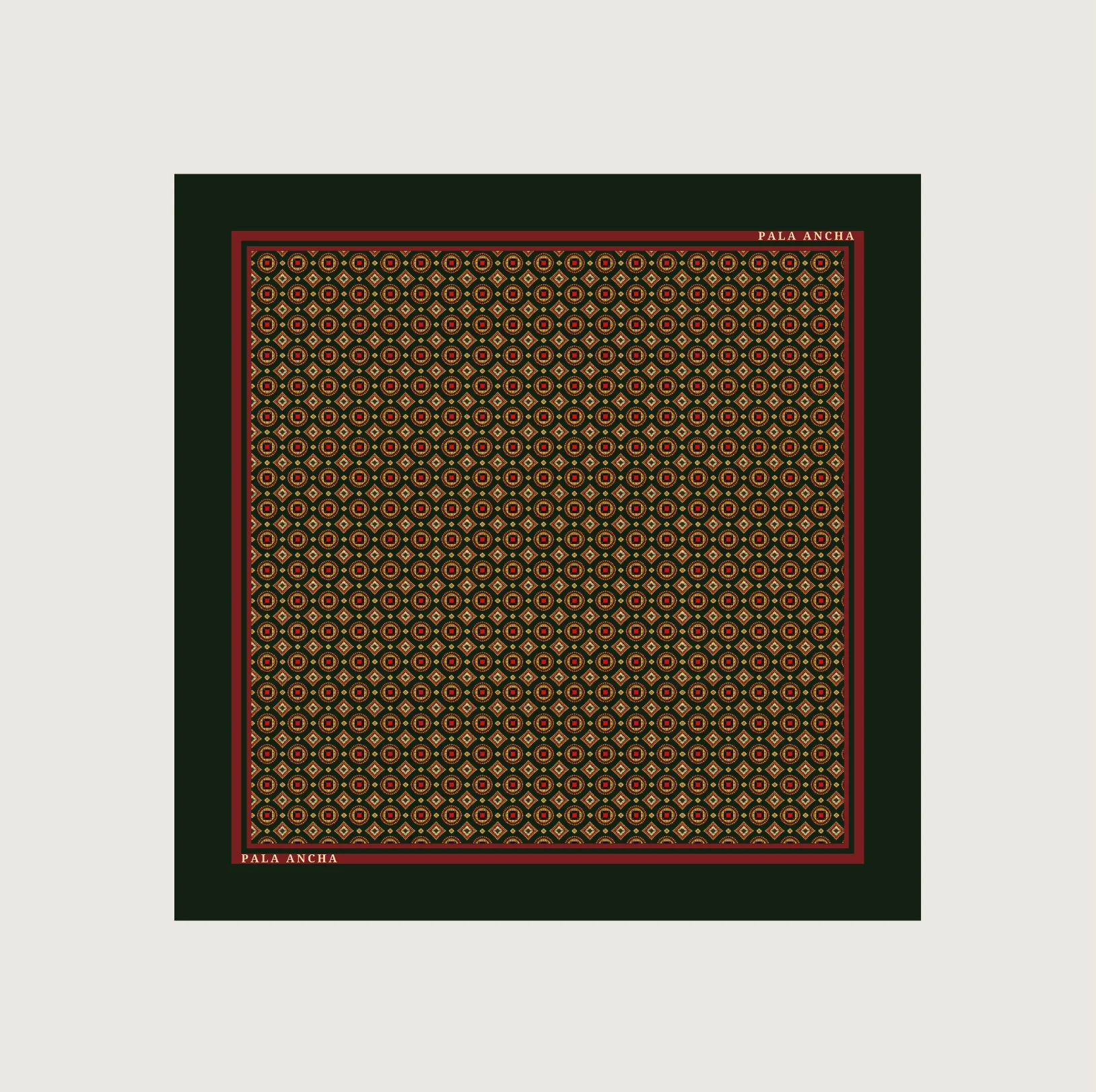 Pañuelo de seda hecho en España, en 26X26 cm, con un refinado diseño geométrico de inspiración clásica. El estampado presenta un elegante patrón repetitivo en tonos verdes profundos, rojos y dorados, que evoca la tradición textil y el gusto por los detalles ornamentales atemporales.