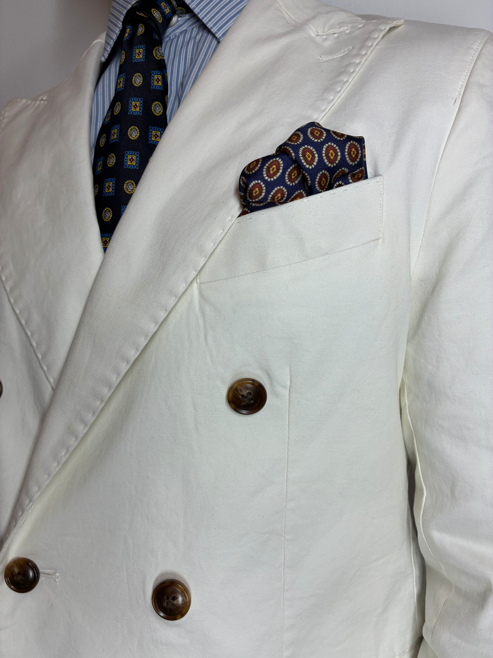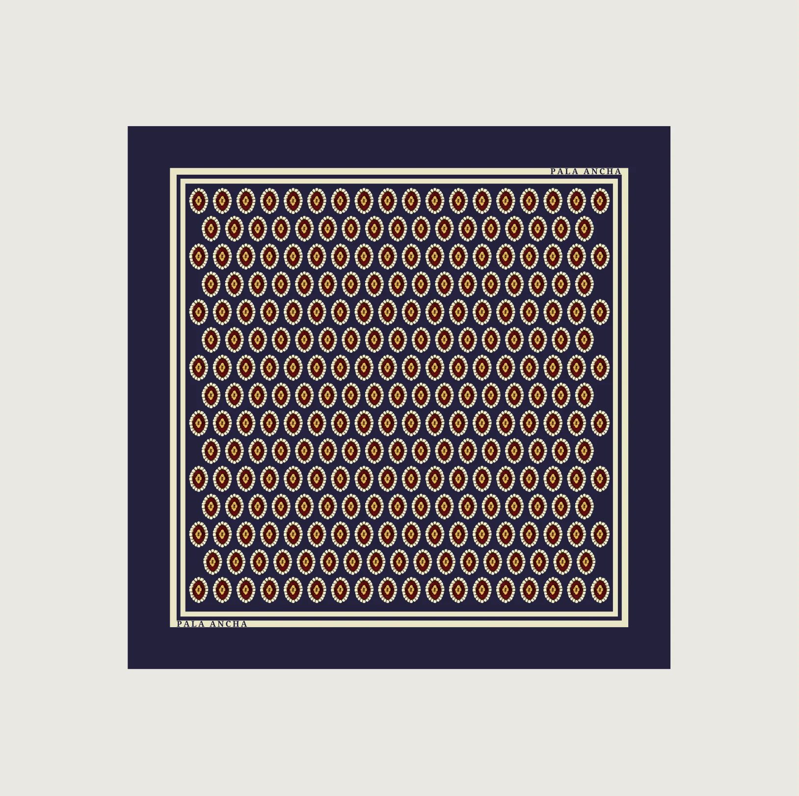 Eleva tu estilo con la sofisticación del azul profundo y un diseño geométrico impecable. Este pañuelo de seda “Pala Ancha” es la elección perfecta para quienes buscan un accesorio con personalidad pero extremadamente versátil. Sobre un fondo azul marino intenso, se presenta un patrón rítmico de medallones elípticos en tonos ocre, granate y crema, creando un efecto visual de textura y profundidad que resalta sobre cualquier solapa.