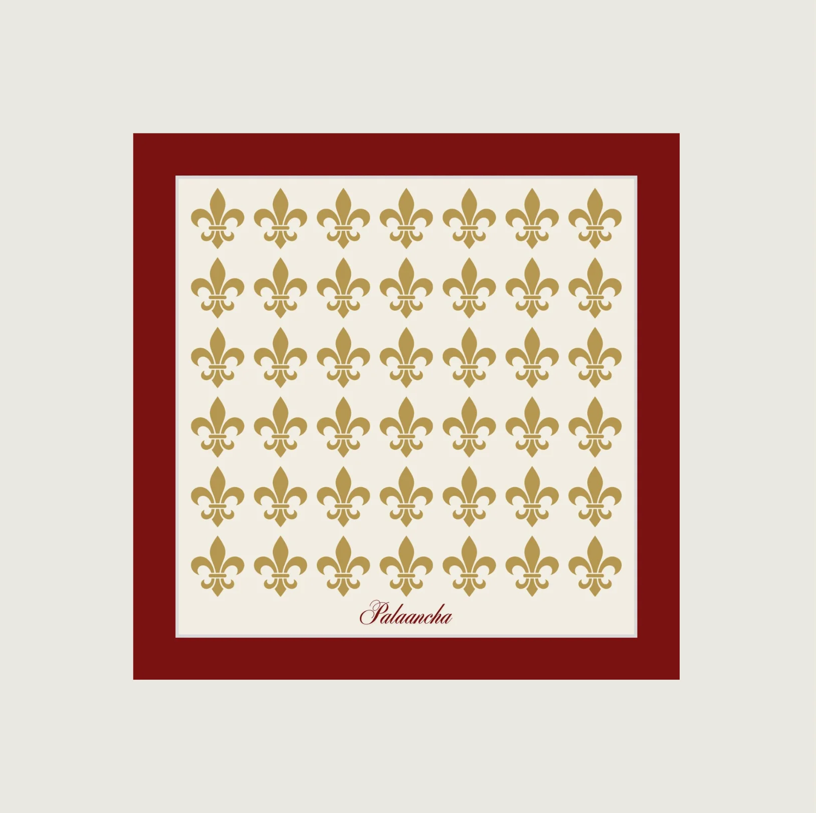 Sobre un fondo marfil luminoso, las flores de lis en tono dorado crean un patrón armónico y sereno, enmarcado por un intenso borde rojo que aporta carácter y profundidad visual. El contraste entre la sobriedad del motivo y la fuerza del color convierte la pieza en un accesorio distinguido, capaz de atraer la mirada sin perder discreción.