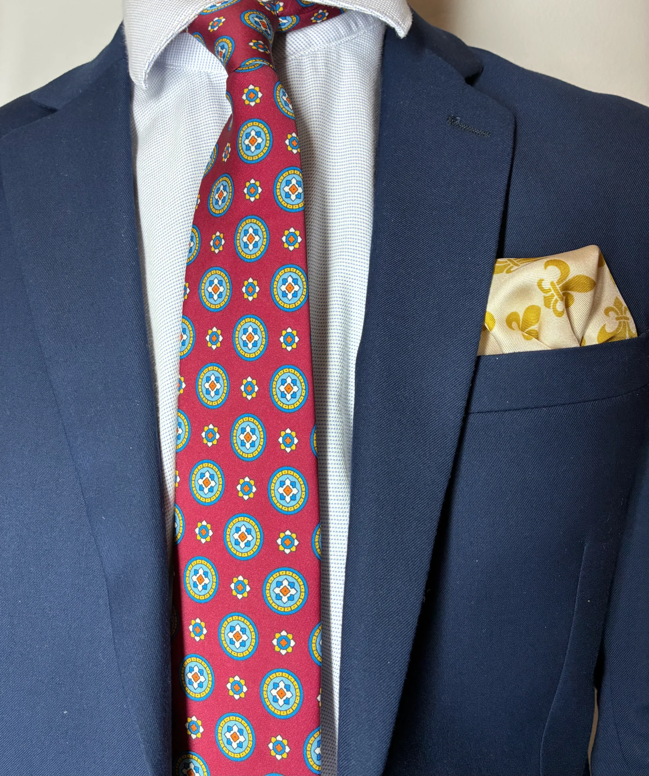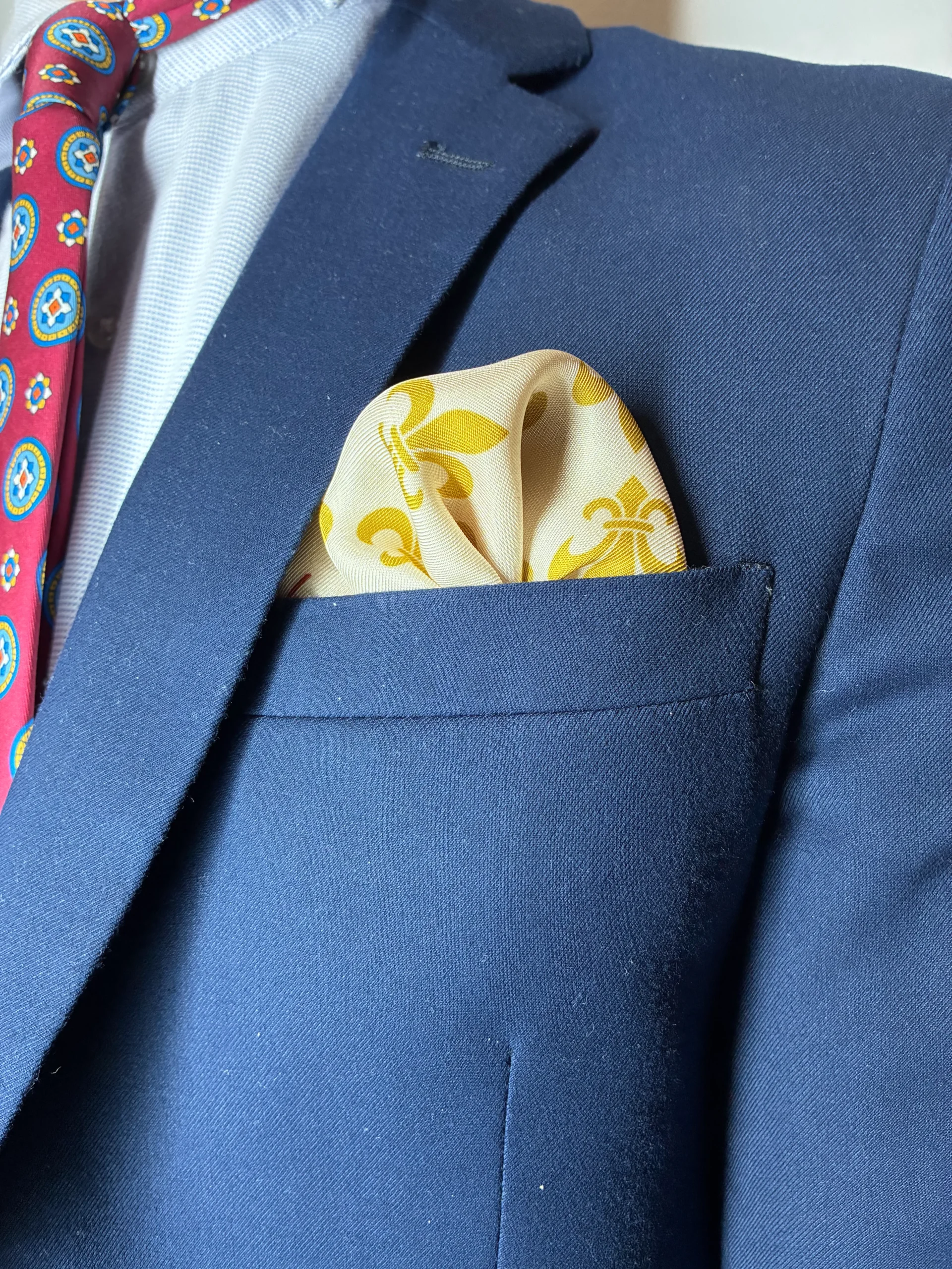 Este pañuelo de bolsillo en seda rinde homenaje a la elegancia clásica y al lenguaje simbólico de la tradición heráldica europea. Su diseño, protagonizado por la icónica flor de lis repetida con equilibrio y precisión, evoca nobleza, historia y un refinamiento que trasciende el tiempo.